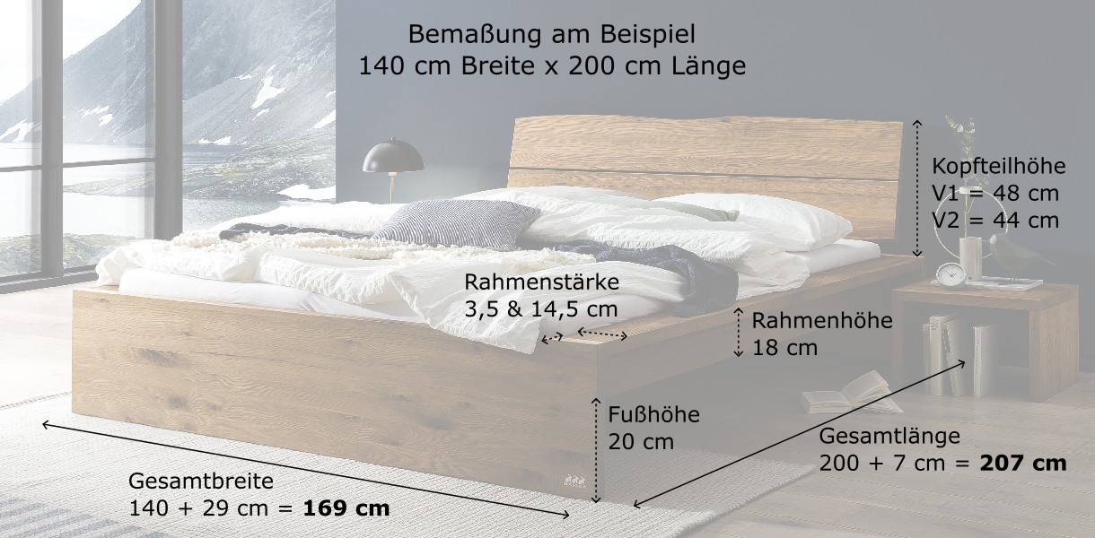 Durch das markante Fußteil und den breiten Seitenrahmen ist es ein echter Hingucker, akzentuiert durch das natürlich geschwungene Kopfteil 1 oder die gerade Variante Kopfteil 2.